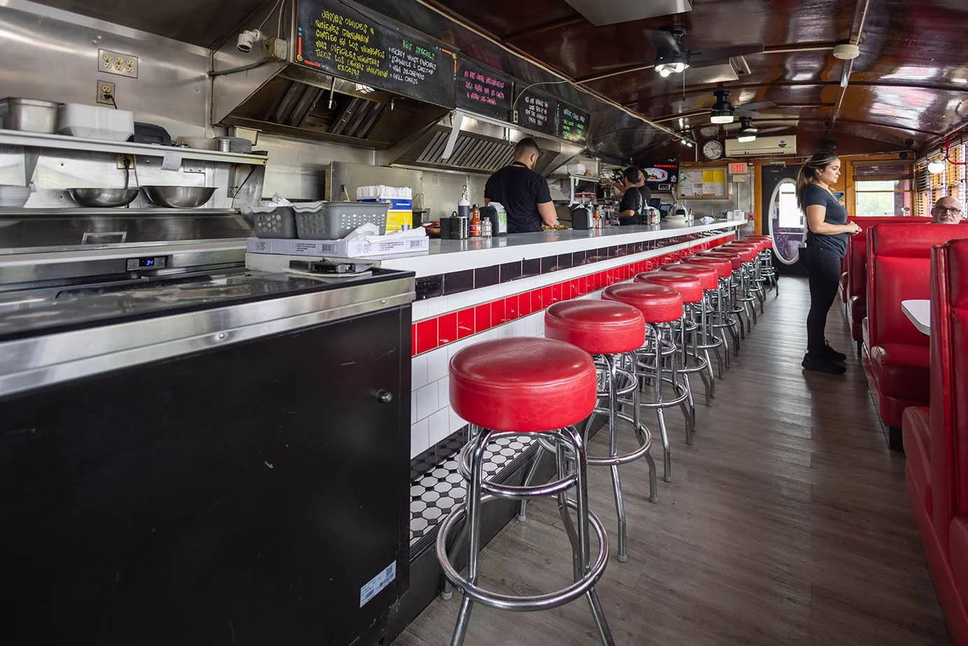 Vibe & Menu: Classic steel-and-chrome diner with wood counters and retro booths. The menu has comfort staples—hot dogs, burgers, breakfast plates, sandwiches, and pie—served in a no-frills, nostalgic setting.
