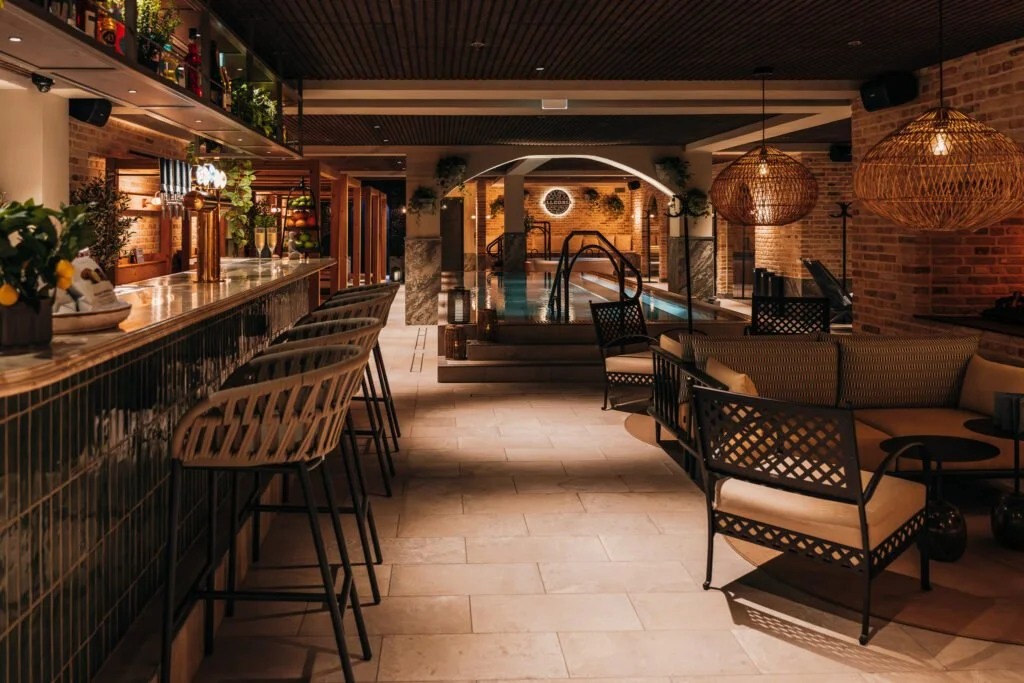 The resort features a 26,000-square-foot spa with 17 treatment rooms, saunas, steam rooms, plunge pools, and a full fitness center with Peloton bikes, yoga, and more, providing a complete wellness experience.
